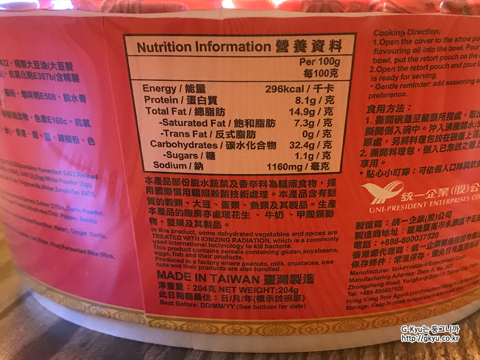 대만에서 만들어지고, 100g당 영양을 기재했다