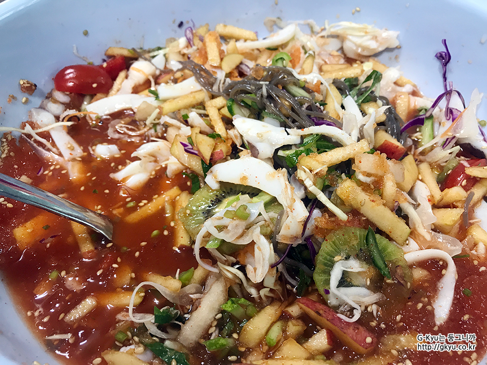 갑오징어 물회처럼 각종 토핑(?)이 없었고, 초장과 각 종 채소가 있었다