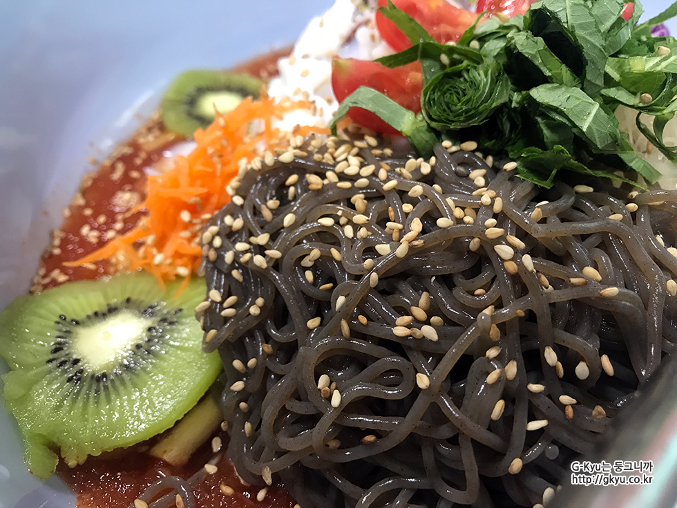팥빙수 토핑 같기도 하고, 탄력 있는 냉면 사리와 위의 맛이 어우러지니,