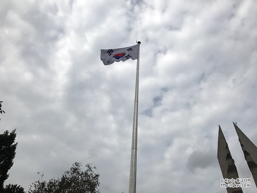 기념탑 좌측엔 대형 태극기가 높이 걸려있고 휘날리고 있었다