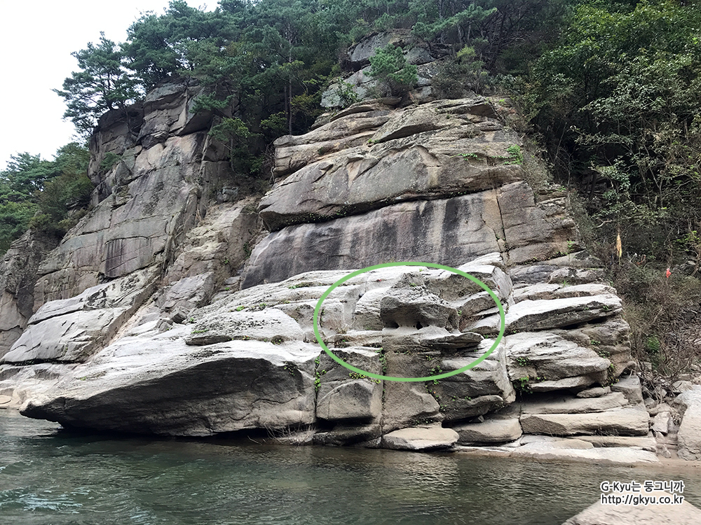 배는 다시 출발했고, 바위를 지나치며 각 명칭을 설명해 주었다 동그라미를 친 곳이 잉어 바위