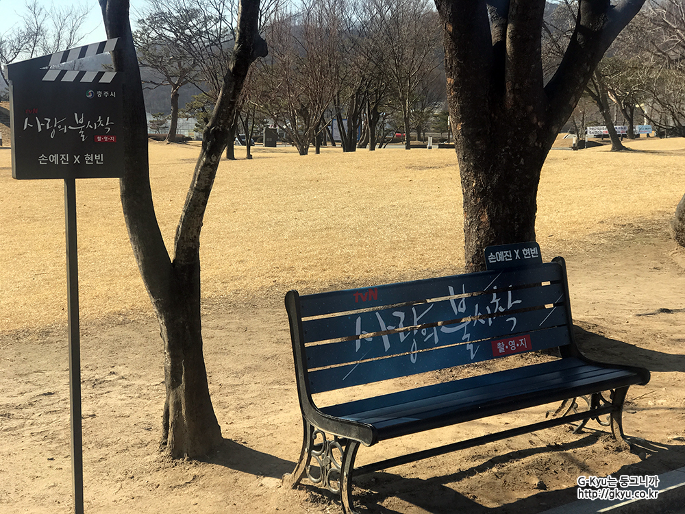 사랑의 불시착 촬영지가 적혀있는 벤치가 보인다