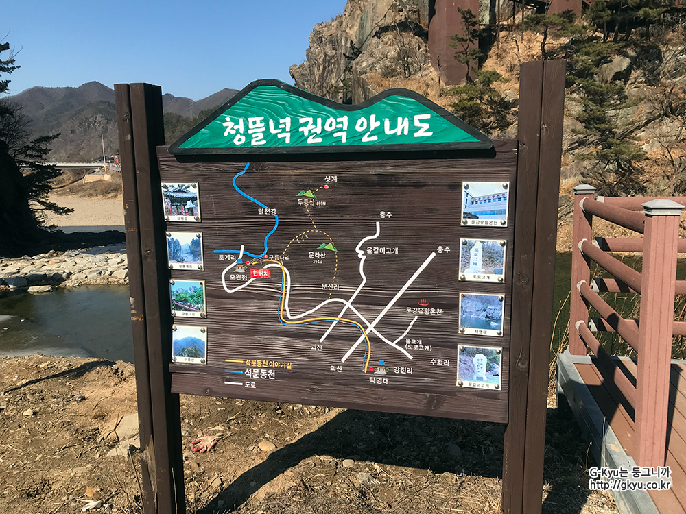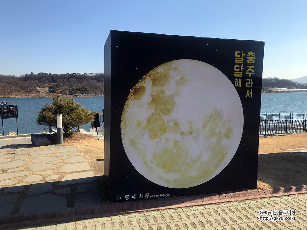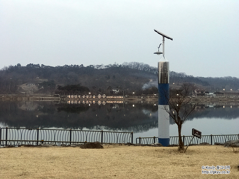 강 건너에 대한민국 중심 고을 충주라고 쓰여있는 글이 보인다