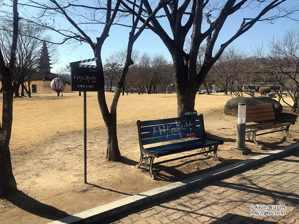 사랑의 불시착 촬영지가 적혀있는 벤치가 보인다