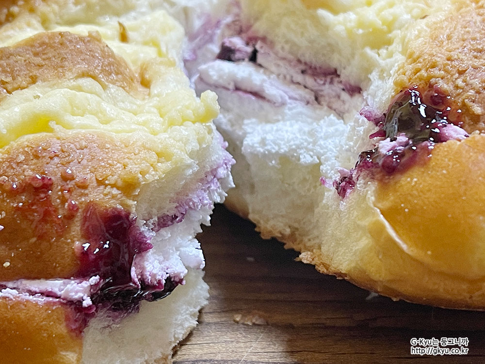 부드러운 빵과 빵 사이에 블루베리와 생크림이