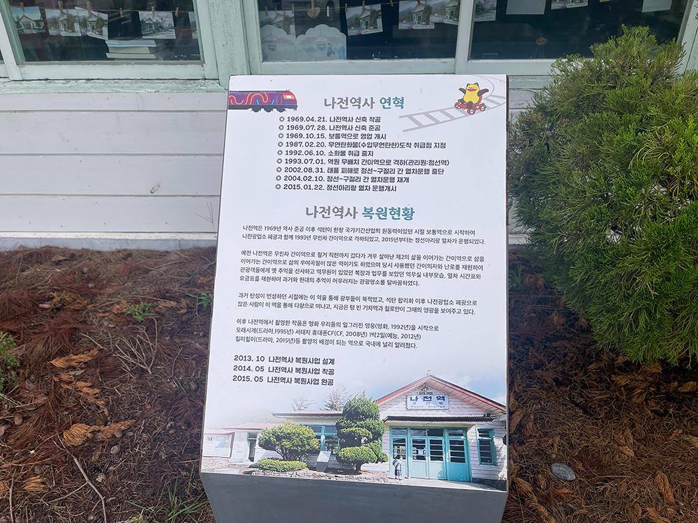 Najeon Station opened as an ordinary station in 1969 with the development of the coal industry. As the Najeon Mining Office of Korea Coal Corporation discontinued its business in 1989, Najeon Station became an unmanned simplified station in 1993. More than 7,000 people lived in Bukpyeong-yeon when Najeon Mining Office operated, but the population decreased rapidly along with the coal industry. Although there was a discussion about the demolition of the station, Najeon Station was restored in 2015 and rebor as a healing space, maintaining the old building. With the operation of A-train (Jeongseon Arrang Train), the station with old portable chairs, stoves, station room, and old timetable presents memories to the visitors.