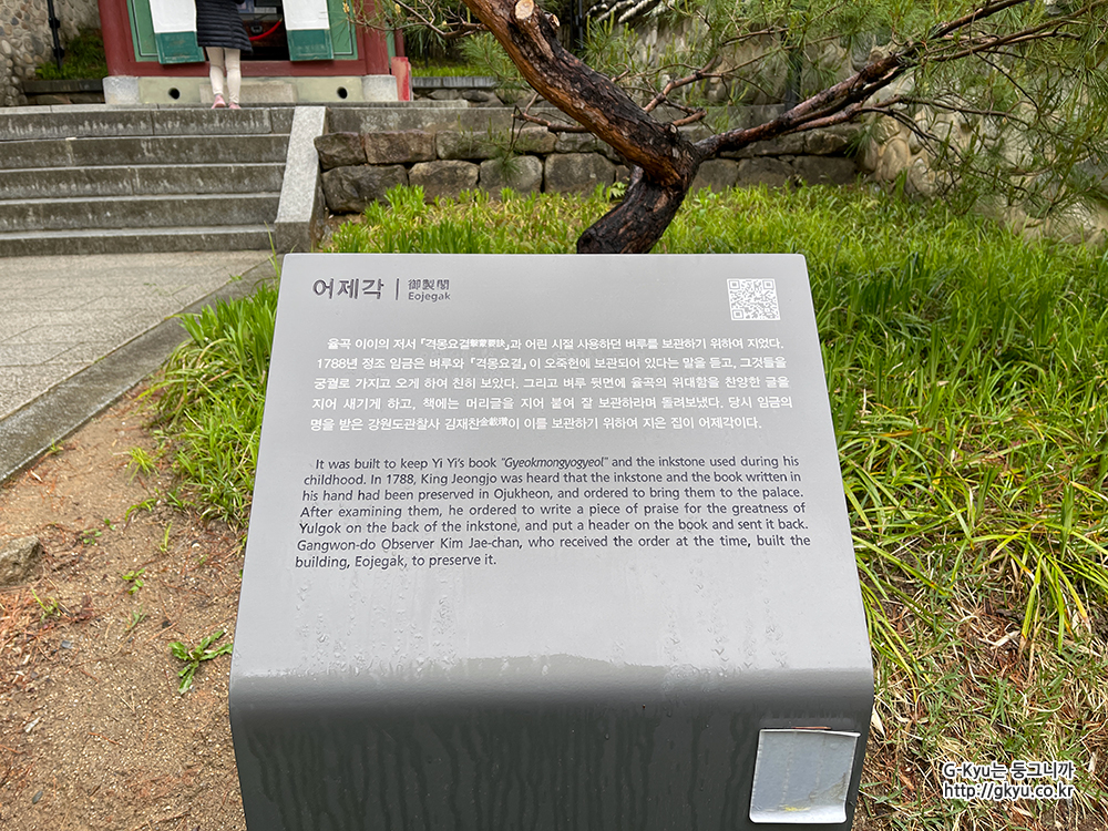 1788년 정조 임금은 율곡 선생이 쓴 [격몽요결]과 어렸을 때 사용하던 벼루를 직접 보고 격몽요결 서문과 벼루 뒷면에 글씨를 써서 돌려보내며 별도의 집을 지어 보관하도록 하였습니다 어명으로 지었다고 해서 어제각이라고 부르며 벼루 뒷면의 내용은 다음과 같습니다