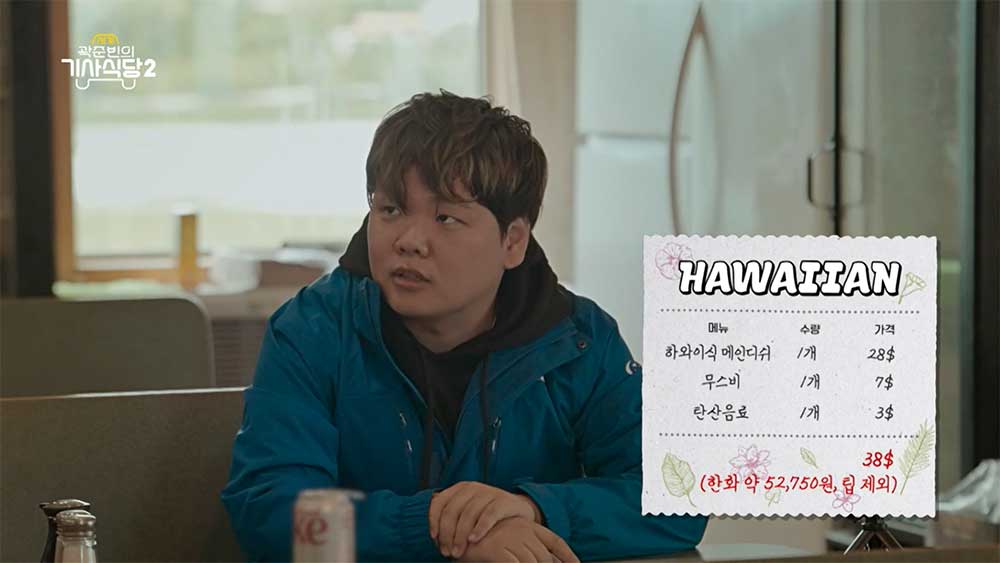 이전에 일 하던 직원이 하와이 출신이어서 하와이 음식 메뉴로 결정했다고 하는 사장님. 곽튜브는 메뉴판을 유심히 본 뒤 1인분을 주문한다. 가격은 하와이식 메인디쉬 $ 28 (USD), 무스비 $ 7 (USD), 탄산음료 $ 3 (USD) 총 $ 38 (USD)이며 한화로 약 52,850원 (환율 약 1,388원). 팁 제외. 만약 팁을 15% 주었다고 가정하면 $ 5.7 (USD) / 7,911원이 팁이다.