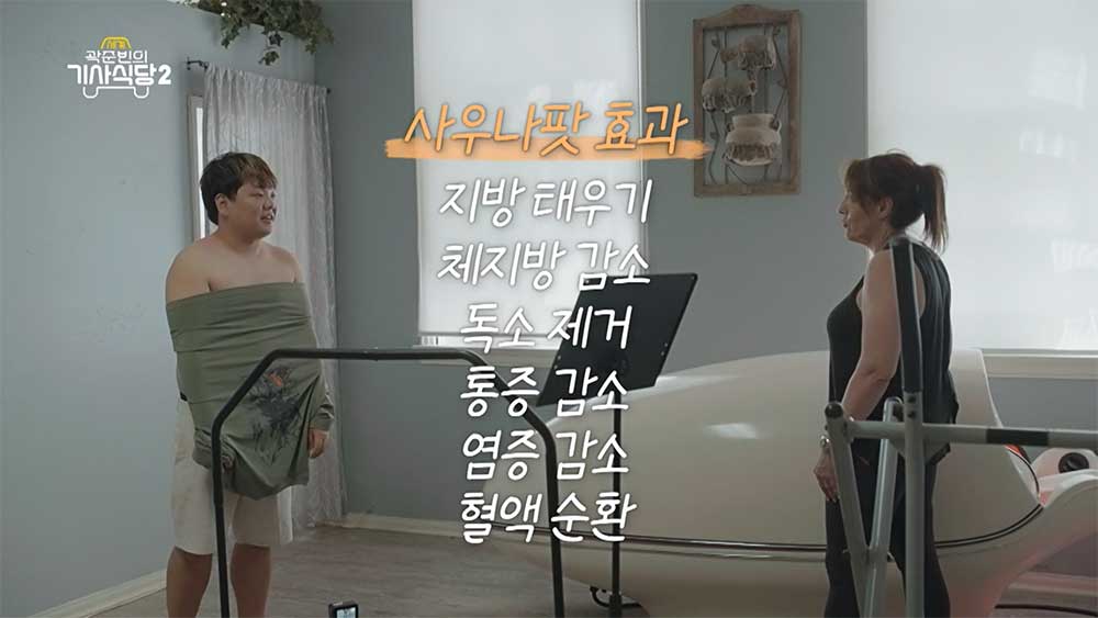 이곳의 주인은 옆에 있는 사우나팟에 들어가면 지방 태우기, 체지방 감소, 독소 제거, 통증 감소, 염증 감소, 혈액 순환에 도움이 된다며 굉장한 홍보를 한다. 나중엔 미라처럼 곽튜브와 이동휘를 만들어 놓고 운동 기구에 올라가게 한 뒤 조금씩 천천히 움직여야 살이 빠진다고 이야기한다.