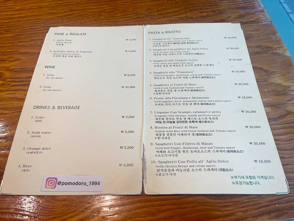 언제가 마지막 방문인지 기억나진 않지만 그때는 없었던 메뉴판에 인스타그램 주소가 보인다. 음식 가격은 물가에 따라 가격이 오른 것이 보인다. 주문할 때 메뉴 이름이 길기 때문에 메뉴 설명을 본 뒤 번호로 주문하면 된다. 제일 많이 주문했던 메뉴는 9번 Spaghetti Con Filetto di Manzo (with bell Pepper, Mushroom, beef and Tomato sauce) 야채와 소고기를 볶은 토마토소스의 스파게티(토마토소스) ※ 소고기: 미국산.