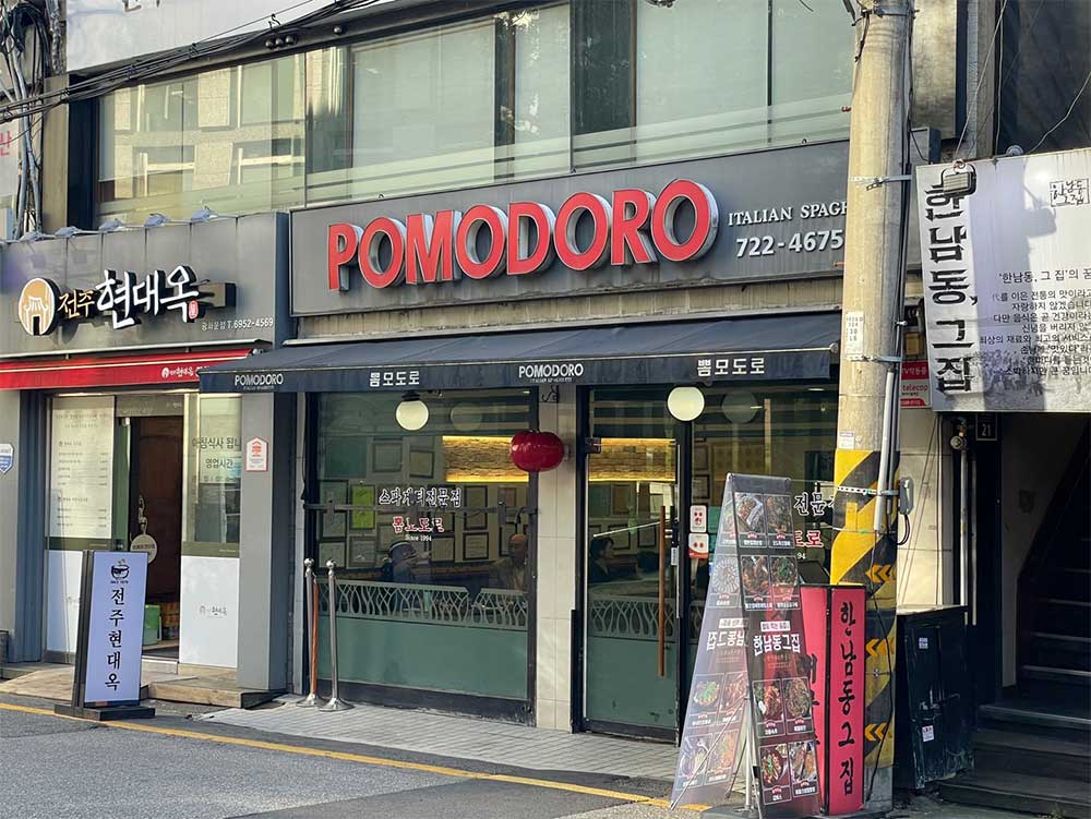 여러 상점 중 기본적으로 많은 상점은 식당이다. 빠르게 식사를 해야 하는 직장인을 상대로 하는 곳도 있고 이곳을 방문한 관광객들을 상대로 하는 식당도 있다. 그중 오랫동안 자릴 지켜 온 식당 중 하나는 뽐모도로.