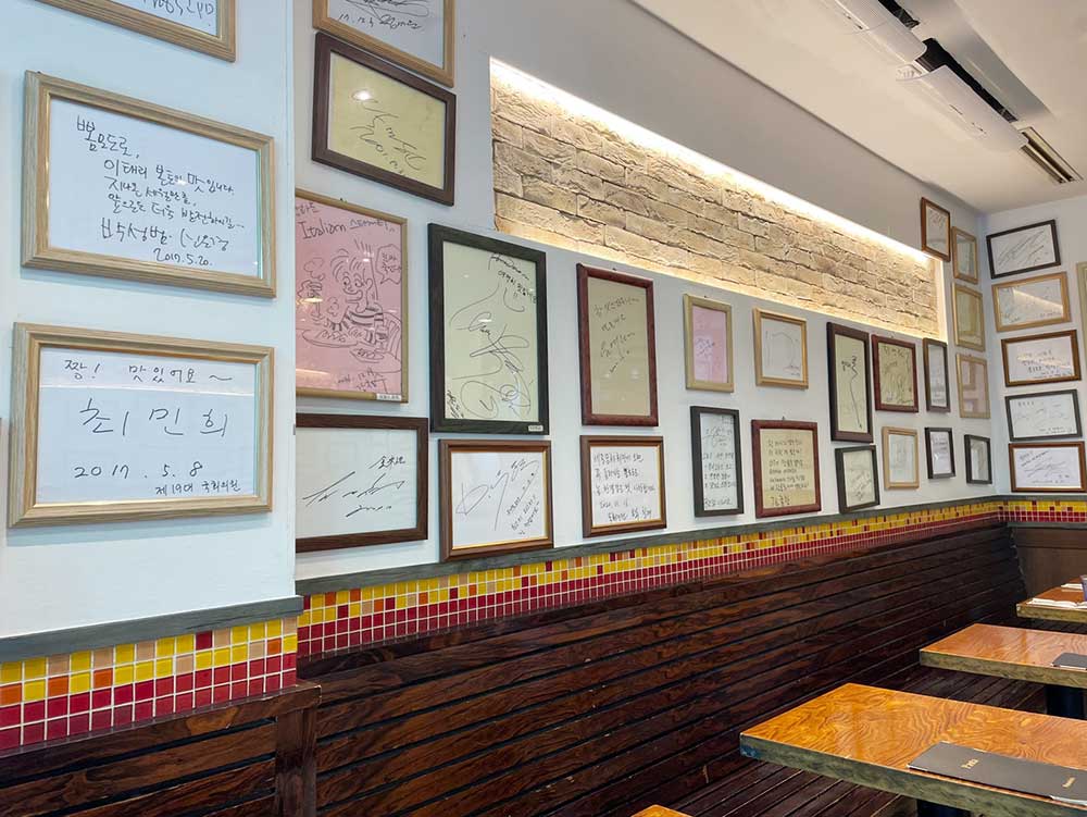 벽에는 그 동안 방문했던 유명인들의 사인과 메시지가 함께 적혀있다. 지금은 티브이나 미디어에서 만나기 힘든 사람들도 있고 아직도 현역으로 왕성히 활동하는 사람. 고인이 된 사람등 우리나라에서 이름 알린 사람들의 역사가 벽면을 가득히 채우고 있다.