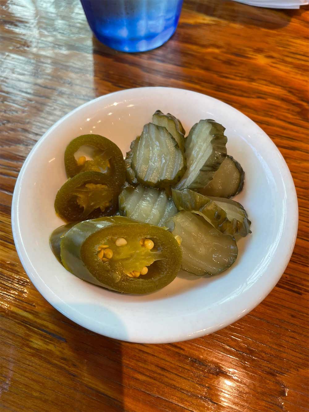 오이 피클과 할라피뇨. 식사 도중 요청하면 채워 주시는 밑반찬이다. 우스개 소리로 할라피뇨는 먹지만 고추 절임은 못 먹어요라는 말이 있는데 이름만 외국식이지 주재료와 조리법이 같기 때문에 그게 그 음식이다.