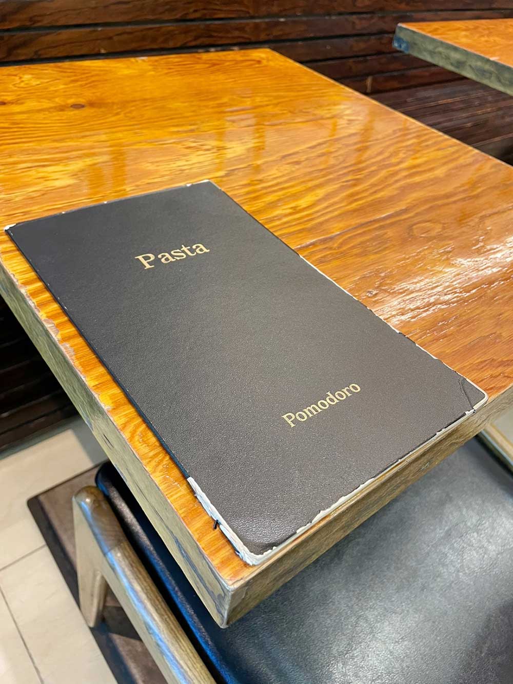 뽐모도로의 특이한 점은 중 하나는 인테리어다. 스파게티라고 하면 그럴듯한 인테리어와 조명이 생각나는데 뽐모도로는 김밥천국처럼 순환율에 중점을 둔 인테리어다. 2인용 식탁이 주로 있으며 공간은 협소하다. 빨리 먹고 나갈 수 있도록 주문부터 식탁 배치까지 모두 최적화를 해 둔 것 같다.