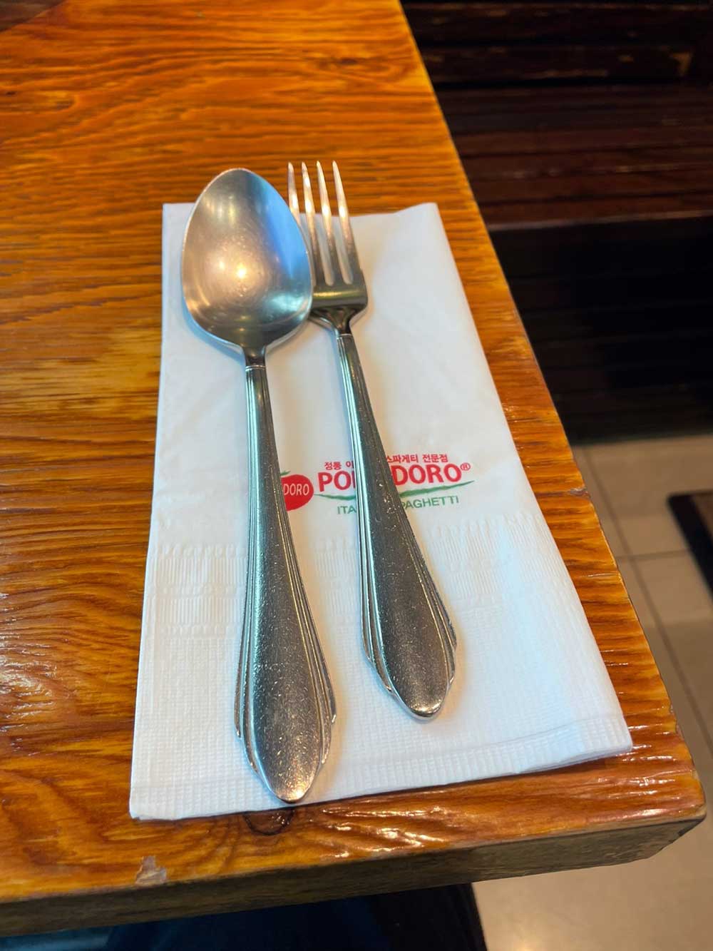 수저와 포크. 이탈리아 식당인 만큼 젓가락보다는 서구식 식사에 맞는 식기가 준비된다. 함께 있는 냅킨은 크기가 커서 무릎에 올리거나 식사 중간중간 입가를 닦을 수도 있다.