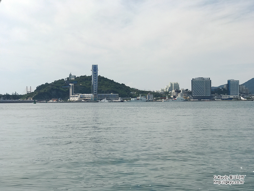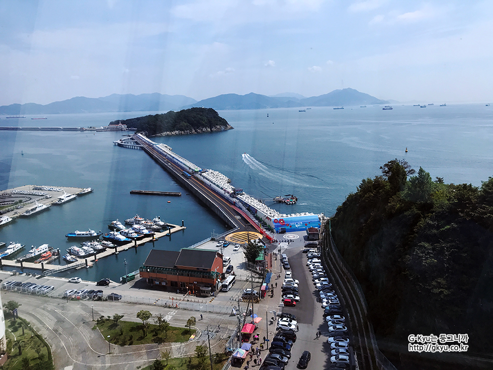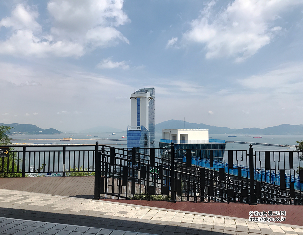 엘리베이터를 타기 전, 밖을 바라본 풍경, 저 멀리 보이는 섬이 오동도이며 방파제 위에 길을 만들어서, 오동도 방파제라고 부른다 작정하고 오동도를 방문했다면, 주차 시설도 있으니 차량으로도 방문이 가능한 곳이다