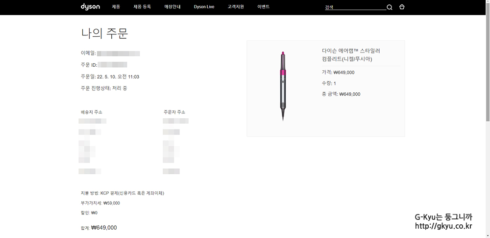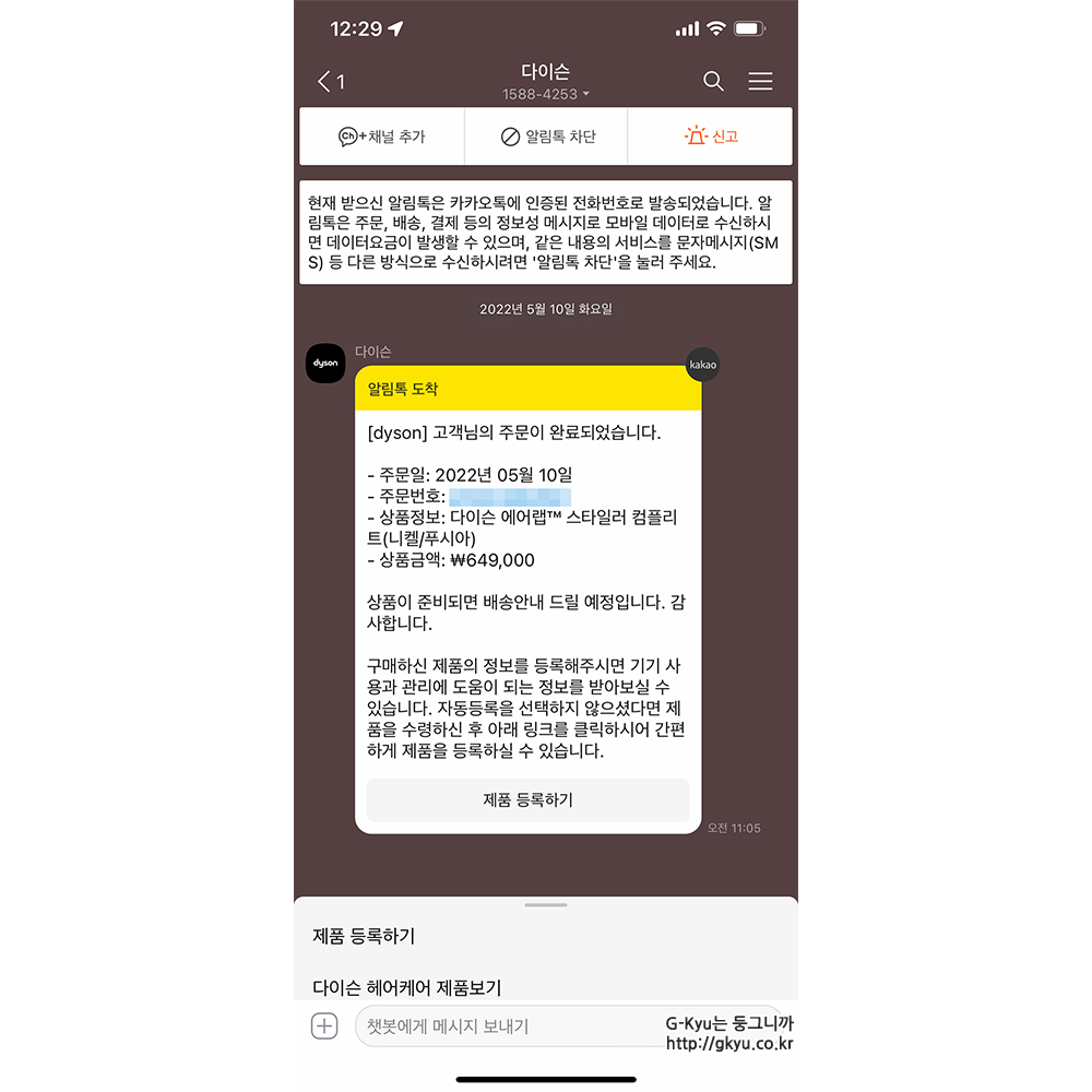 결제가 무사히 끝나자 다이슨에서 카톡이 왔다