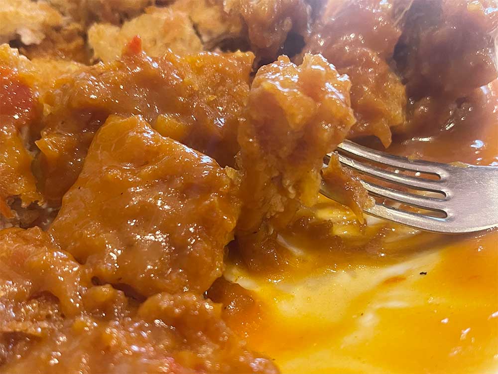 일본식 돈가스처럼 두꺼운 고기는 아니지만 경양식 돈가스가 원래 두꺼운 고기로 만든 것이 아니므로 그 시절의 모습을 유지한 것 같다.