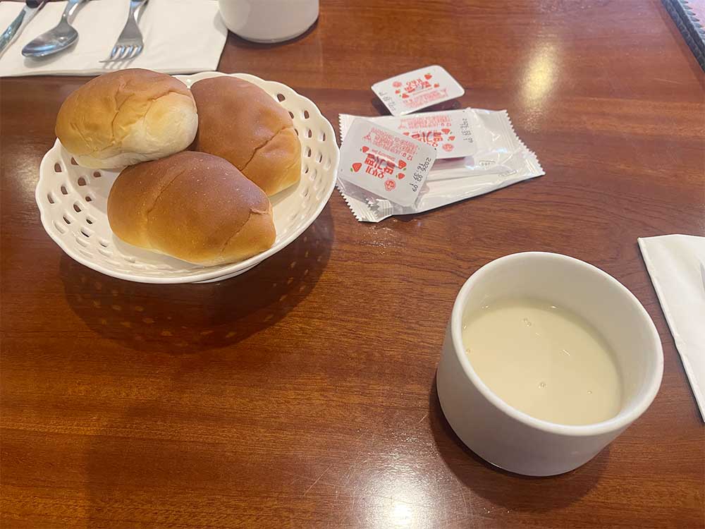 따뜻한 모닝빵과 딸기잼. 그리고 경양식 하면 떠 오르는 크림 수프가 그 시절 추억을 떠 올린다.