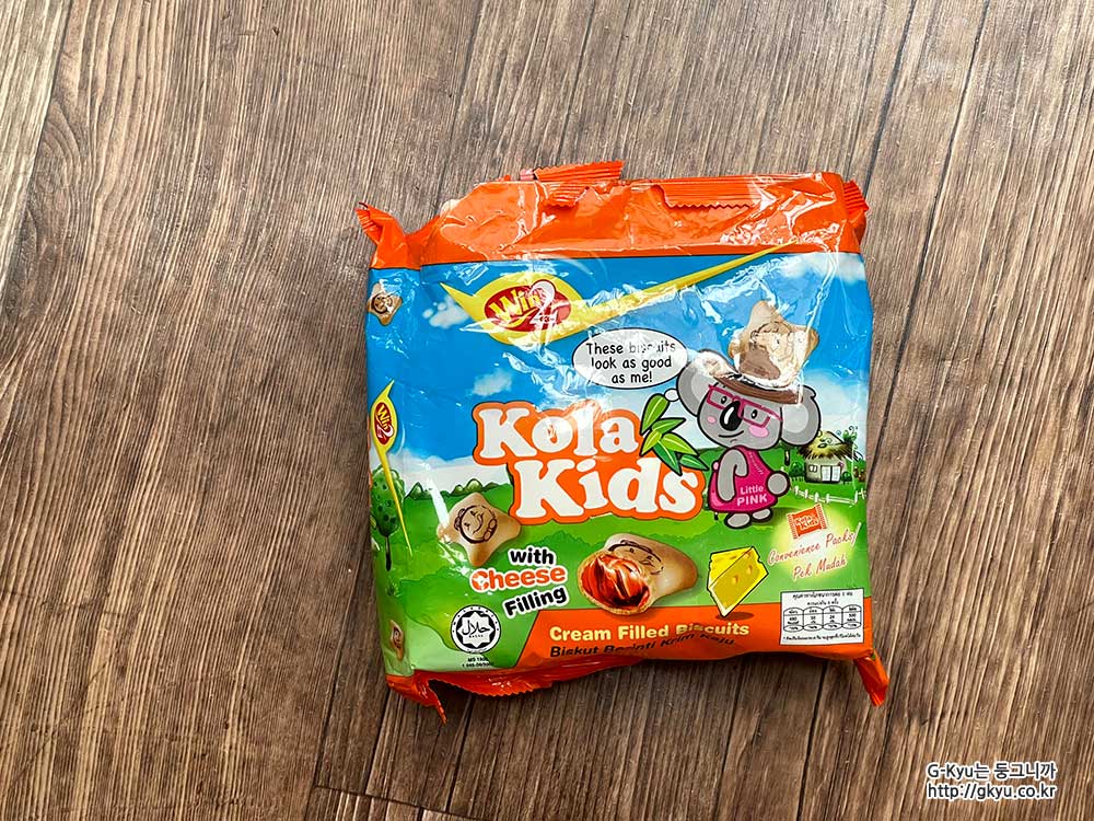 포장지를 보니, 과자 안에 치즈 크림이 들어있는 비스킷이라고 광고를 한다.