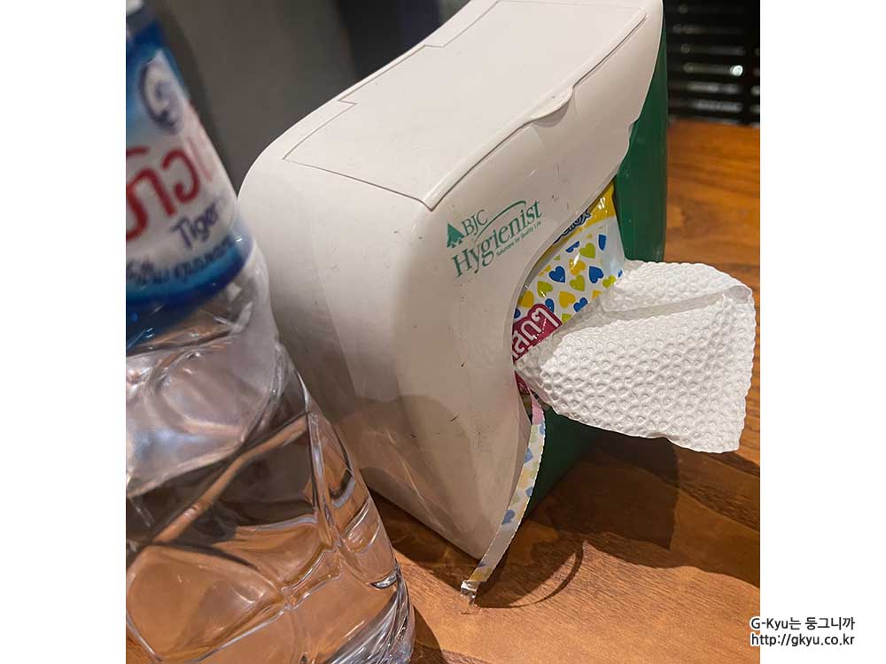 냅킨 케이스가 특이했는데, 한국은 위로 뽑아 쓴다면,