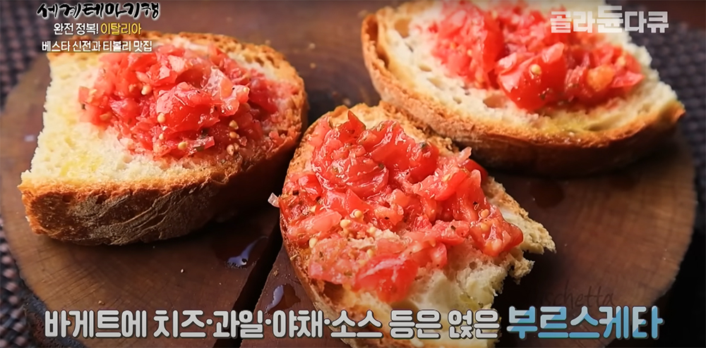 바게트에 치즈, 과일, 야채, 소스 등을 얹은 부르스케타 (Bruschetta)는 단순한 재료들인 빵, 올리브, 토마토만 있는데 맛있다고 한다.