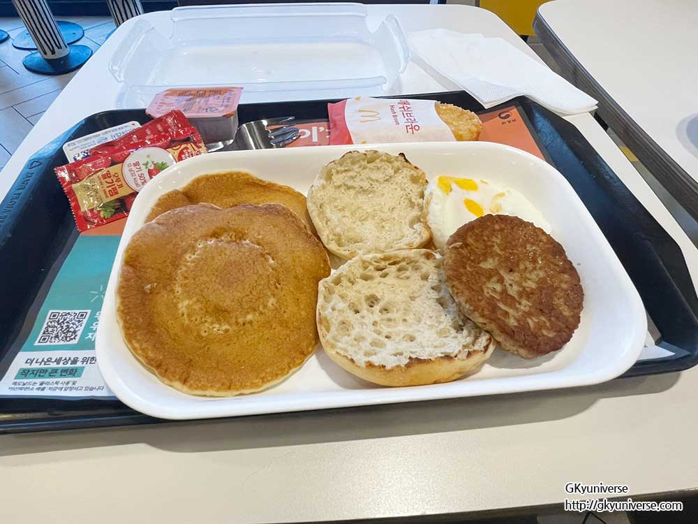 머핀과 소시지 그리고 핫케이크, 해시 브라운을 먹고
