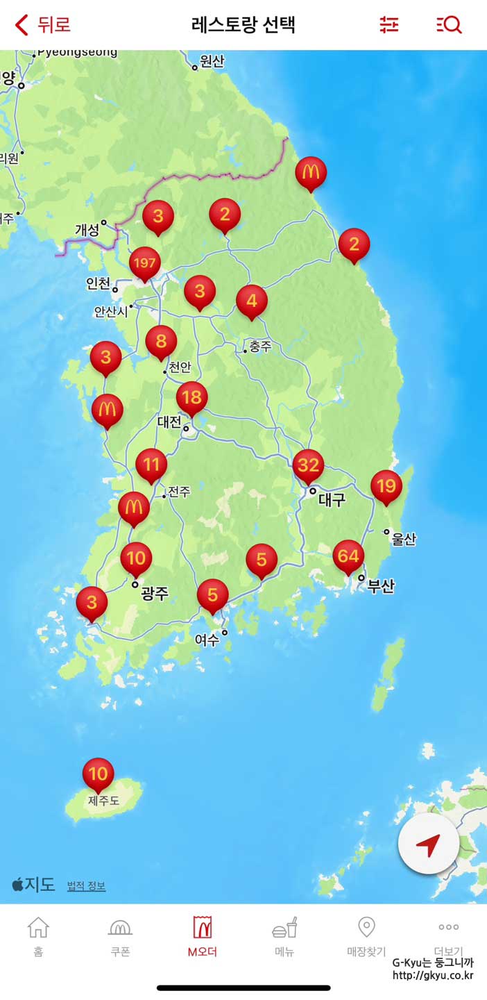 휴대폰 하단에 M오더 라고 적힌 부분을 클릭하면, 우리나라 맥도날드 매장이 지도에 나온다.
