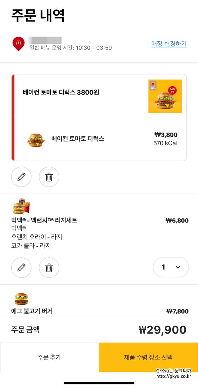 주문하고자 하는 음식들을 모두 고르면, 제품 수령 장소 선택을 클릭한다.