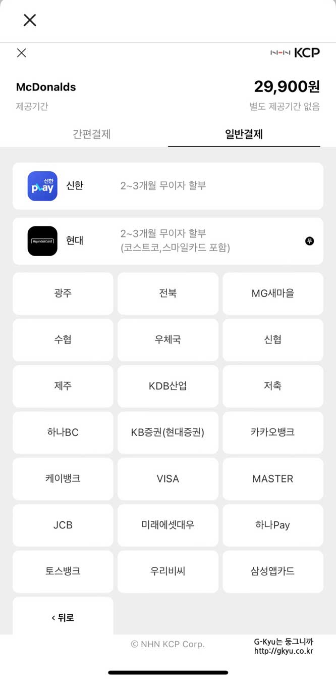 간편 결제로 할 수 있는 결제 방법이 없어서 일반 결제를 클릭했다.