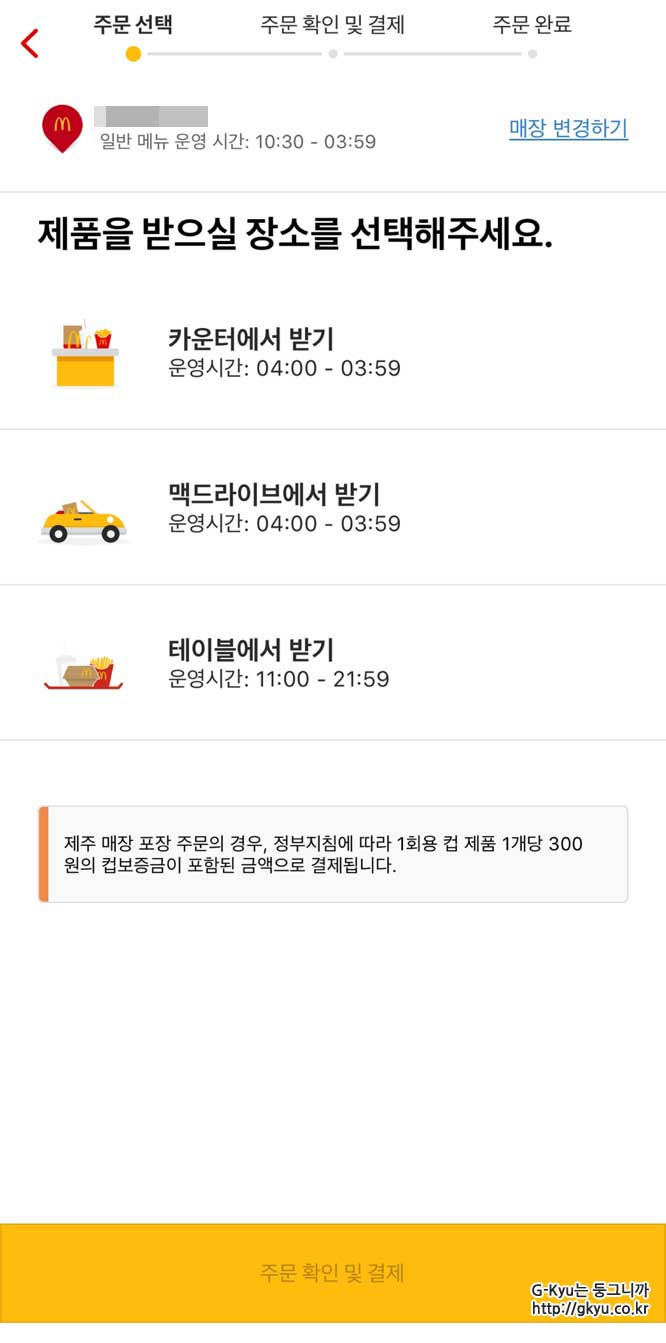 주문하고자 하는 음식들을 모두 고르면, 제품 수령 장소 선택을 클릭한다.