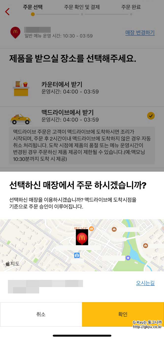 드라이브 스루 (맥 드라이브)를 통해 제품을 받기 위해 맥 드라이브에서 받기를 클릭한다.