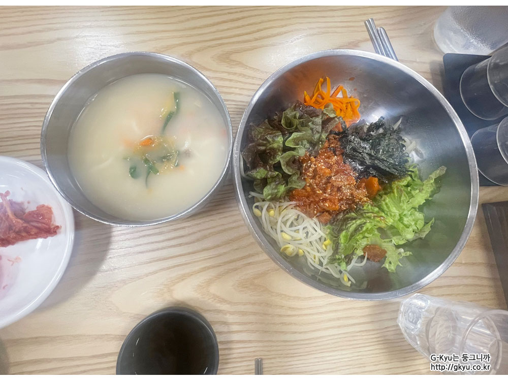 면이 불기 때문에 칼국수를 먼저 먹고, 제육 비빔밥을 먹으면 되겠다.