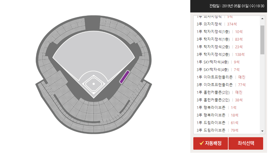 1루 또는 3루 의자 지정석 1 층부터