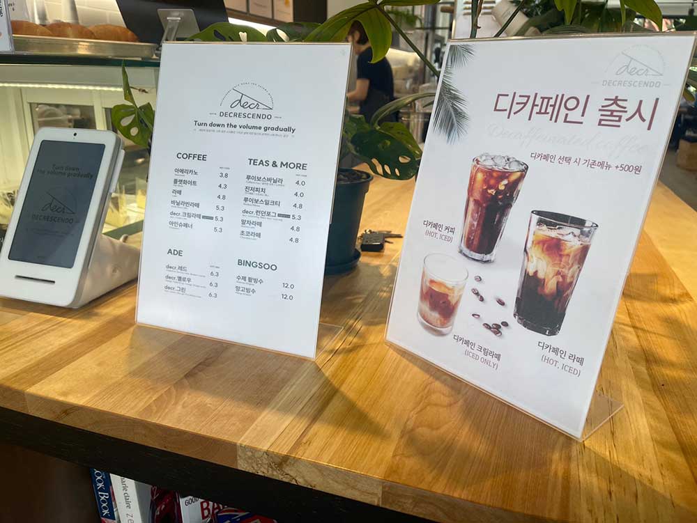 카페의 본질은 커피를 마시기 위해 찾는 것이므로 메뉴판을 살펴본다. 김밥천국처럼 수많은 메뉴를 다루지 않는다. 15가지 정도의 음료와 2가지의 계절 메뉴가 눈에 들어온다. 카페인에 민감한 소비자를 위해 디카페인 음료도 제공하고 있는데 한국인들이 사랑하는 아메리카노를 시작으로 크림 라테와 라테 모두 디카페인으로 제공한다.