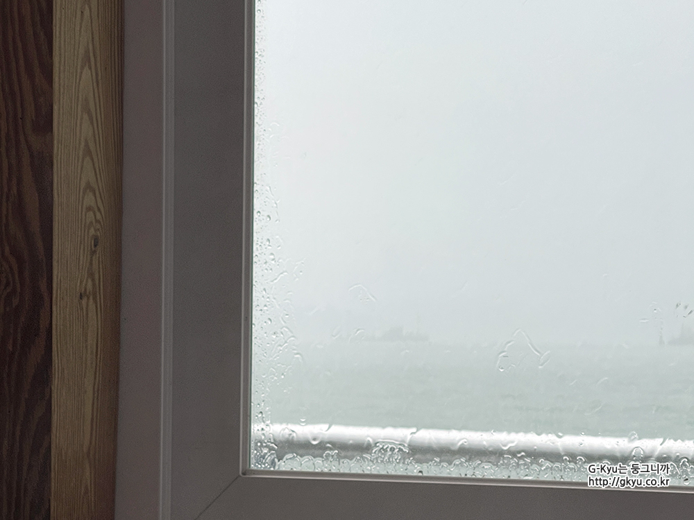 창문에 빗소리가 들릴 정도로 세차게 소나기가 내린다
