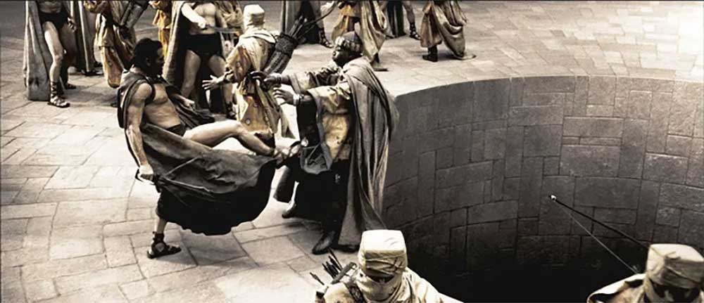 레오니다스 왕에게 항복을 권하러 온 페르시아 사신의 말을 거부하며 앞 발차기로 사신을 구덩이로 차 넣는 모습. 강력한 페르시아 군대 앞에 목숨을 부지하려면 이와 같은 행동은 곧 죽음을 각오한다는 의미임에도 곧 죽어도 자존심을 굽힐 수 없다는 의지를 보여 준 행동이다.