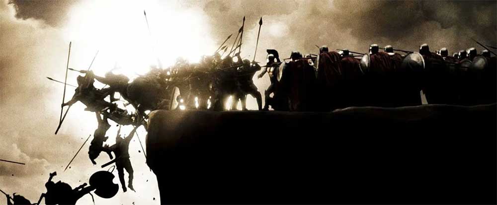 레오니다스 왕에게 항복을 권하러 온 페르시아 사신의 말을 거부하며 앞 발차기로 사신을 구덩이로 차 넣는 모습. 강력한 페르시아 군대 앞에 목숨을 부지하려면 이와 같은 행동은 곧 죽음을 각오한다는 의미임에도 곧 죽어도 자존심을 굽힐 수 없다는 의지를 보여 준 행동이다.