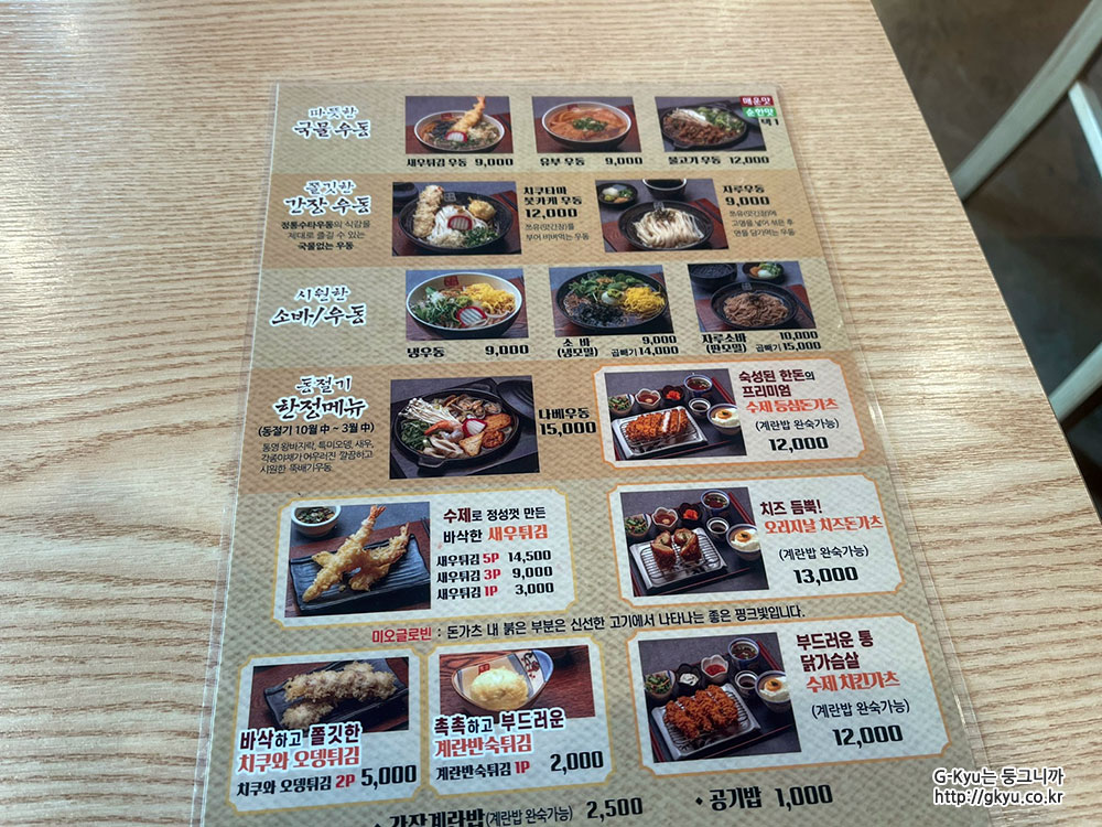 국물 우동, 간장 우동, 소바, 시즌 메뉴 그리고 돈가츠, 치킨가츠, 튀김류