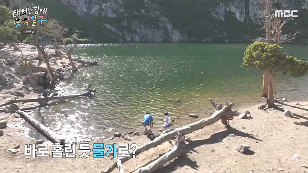 물을 보자마자 수온을 체크하는 기안84. 몇 도 같냐는 빠니보틀의 질문에 6도 정도 될 것 같다고 한다. 빙하가 녹아 내려 온 물이다 보니 차가운 것 같다. 세수를 하고 한 모금 마셔보는 기안84. 유태오가 물은 안 마시는 게 좋겠다고 했지만 이미 늦었다.