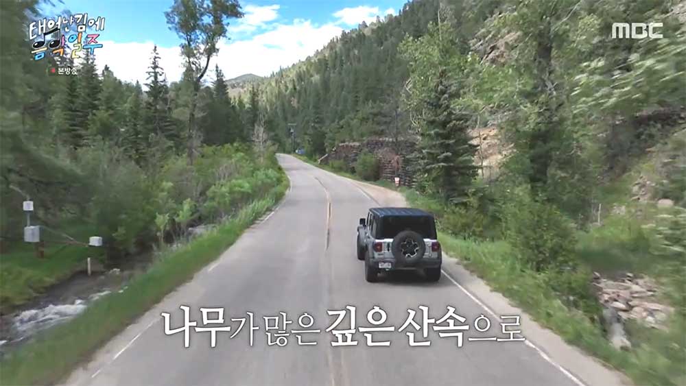 고속도로를 달리던 SUV 차량은 고속도로를 나와 Fall 강을 따라 로키 산맥을 타고 올라간다.