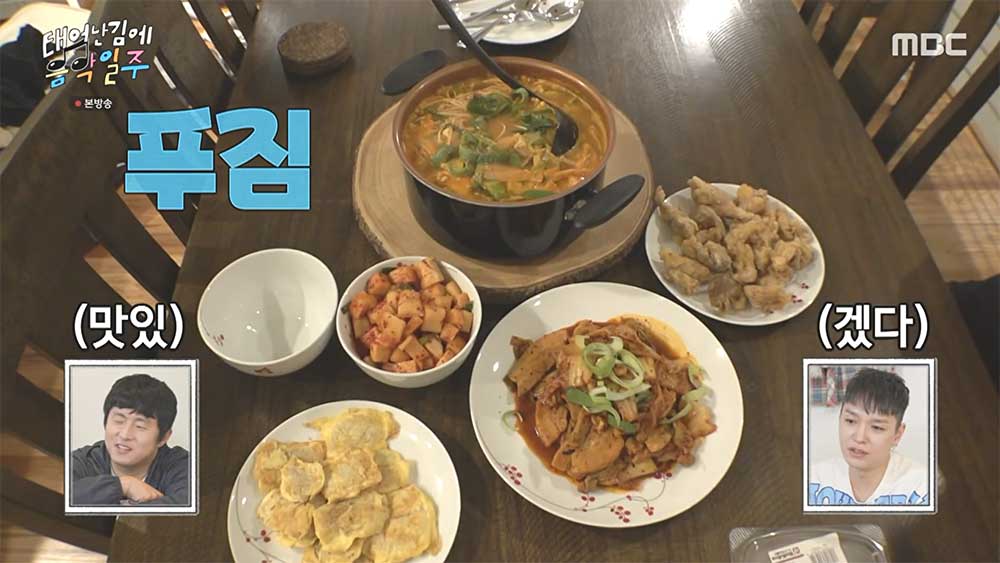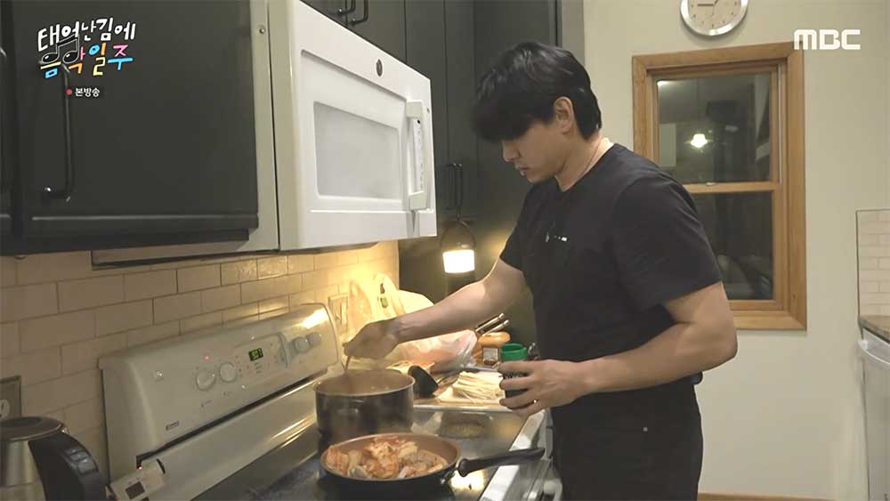 주방에서 요리를 하는 유태오. 한 번에 2가지 요리를 한다. 프라이팬의 요리는 김치와 삼겹살을 사용한 김치 두루치기. 그리고 된장찌개를 얼큰하게 끓인다. 요리 전에 욕조에 물을 받아 놓아서 빠니보틀은 유태오가 받아 놓은 목욕물에 목욕을 한다.