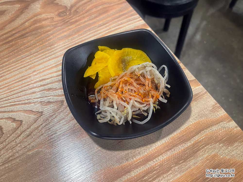 밑반찬으로 단무지와 콩나물이 나왔는데, 뭔가 부족해 보이고
