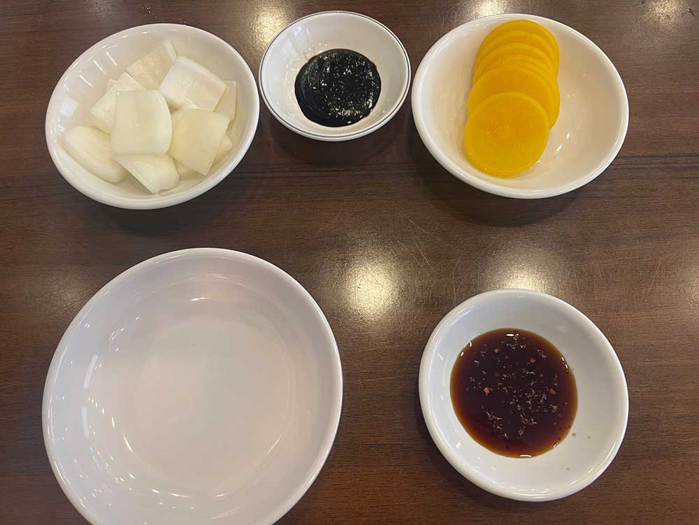 앞접시로 사용할 수 있는 그릇 1개와 빈 소스 그릇이 있있는데 소스 그릇엔 테이블에 있는 간장과 고춧가루로 군만두를 찍어 먹을 소스를 만들어 놓고 기다린다.