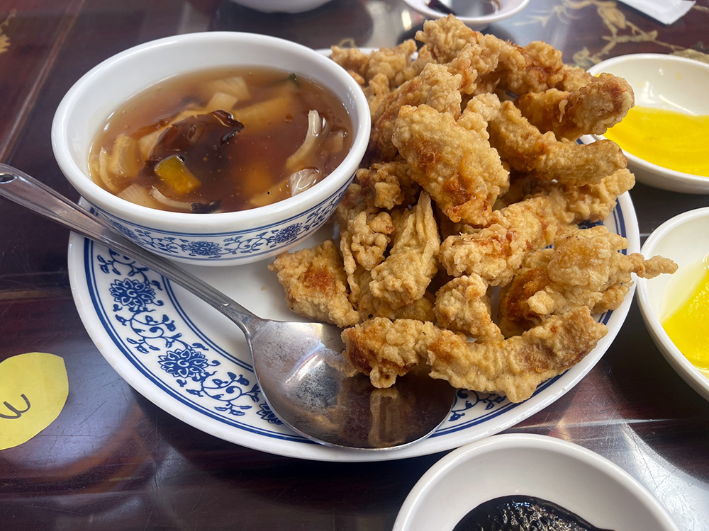 얇은 튀김옷이 이었는지 몰라도 푹신한 느낌보다는 딱딱하기 바로 직전의 식감과 닭고기 맛이 날 것 같은데 돼지고기 탕수육인 맛이다.