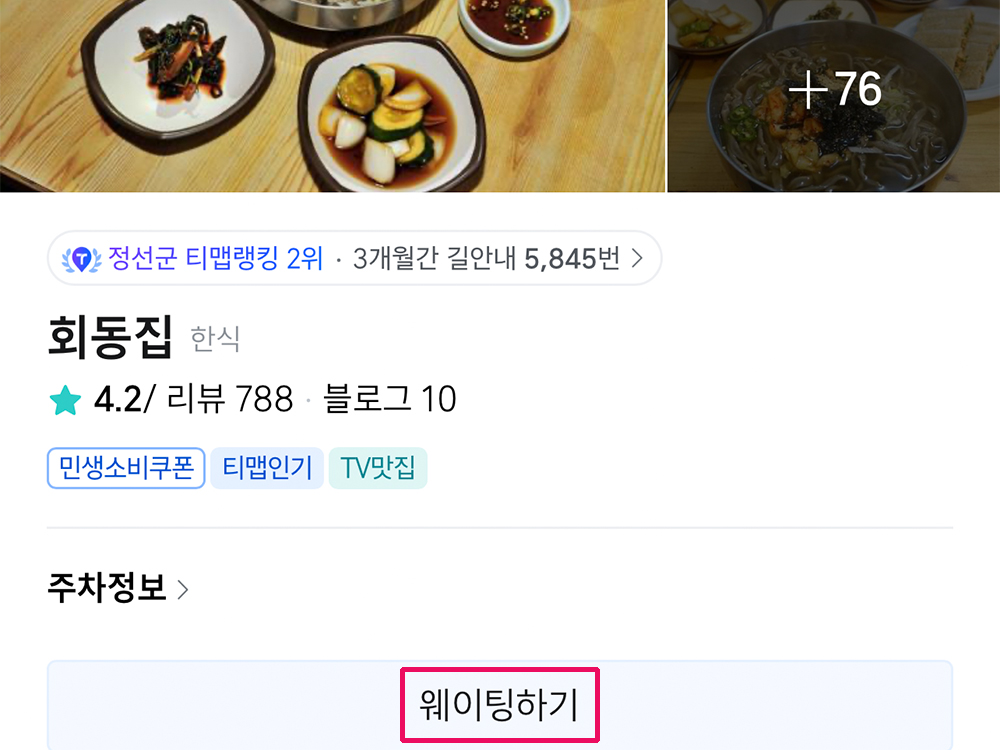 티맵을 켜고 방문할 식당을 찾으면 이와 같이 <웨이팅 하기 > 메뉴를 볼 수 있다.
