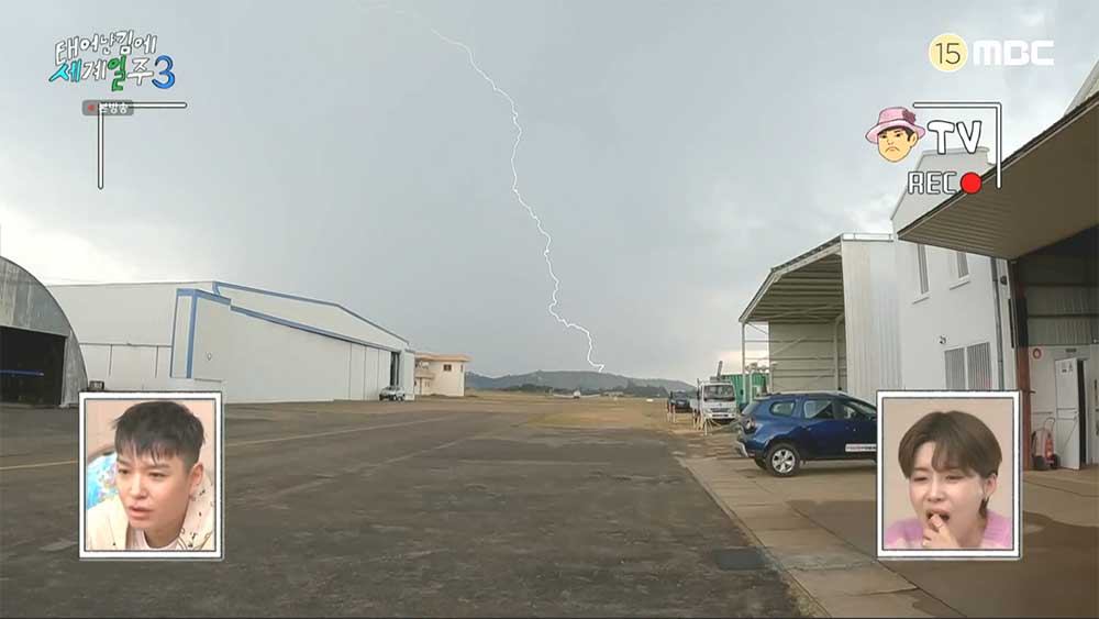 이동 시간은 길었어도 순탄하게 이동했던 태계일주 팀은 천둥번개를 동반한 비를 맞게 되었다.