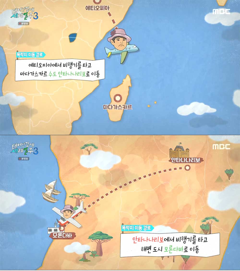 한국 -> 에티오피아 -> 마다가스카르 수도 안타나나리보 -> 모론다바