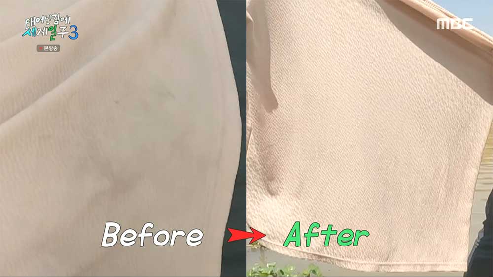 정말 빨래되는지 스튜디오의 질문에 이렇게 빨기 전과 빤 후의 비교 사진을 보여 준다.