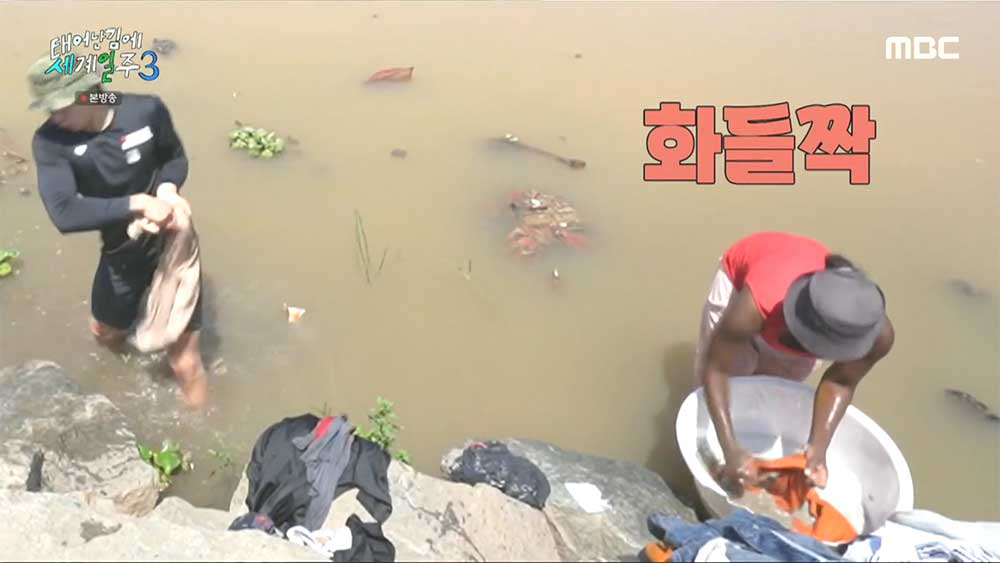 강 한편에 자리를 잡고 빨래를 하려고 하는데, 세제도 없고,